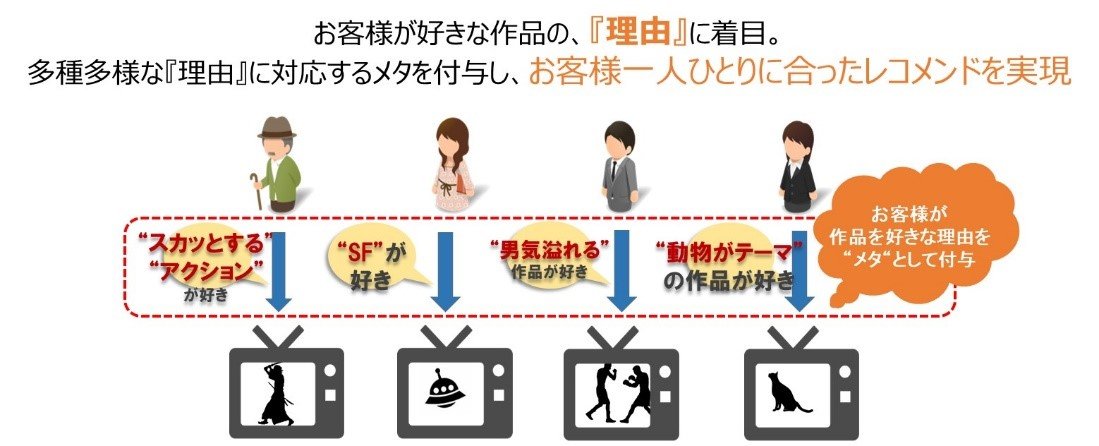 そこで、好き(Like)から理由(Why)を紐解き、お客さまの深層情報(キモチ)に沿った番組提案を行うことができる「番組レコメンド支援システム」というツールを作成・活用しています。このツールには、映画・ドラマなど各作品に対し基本情報のジャンルや出演者だけでなく、作風や視聴した時に感じる雰囲気・気分などの構成要素が登録されています。好みやご覧になった番組をヒアリングしシステムに入力することで、お客さまに"ささる"番組を導き出すことが可能となり、キモチに寄り添った番組提案を行うことでロイヤリティ向上に取り組んでいます。